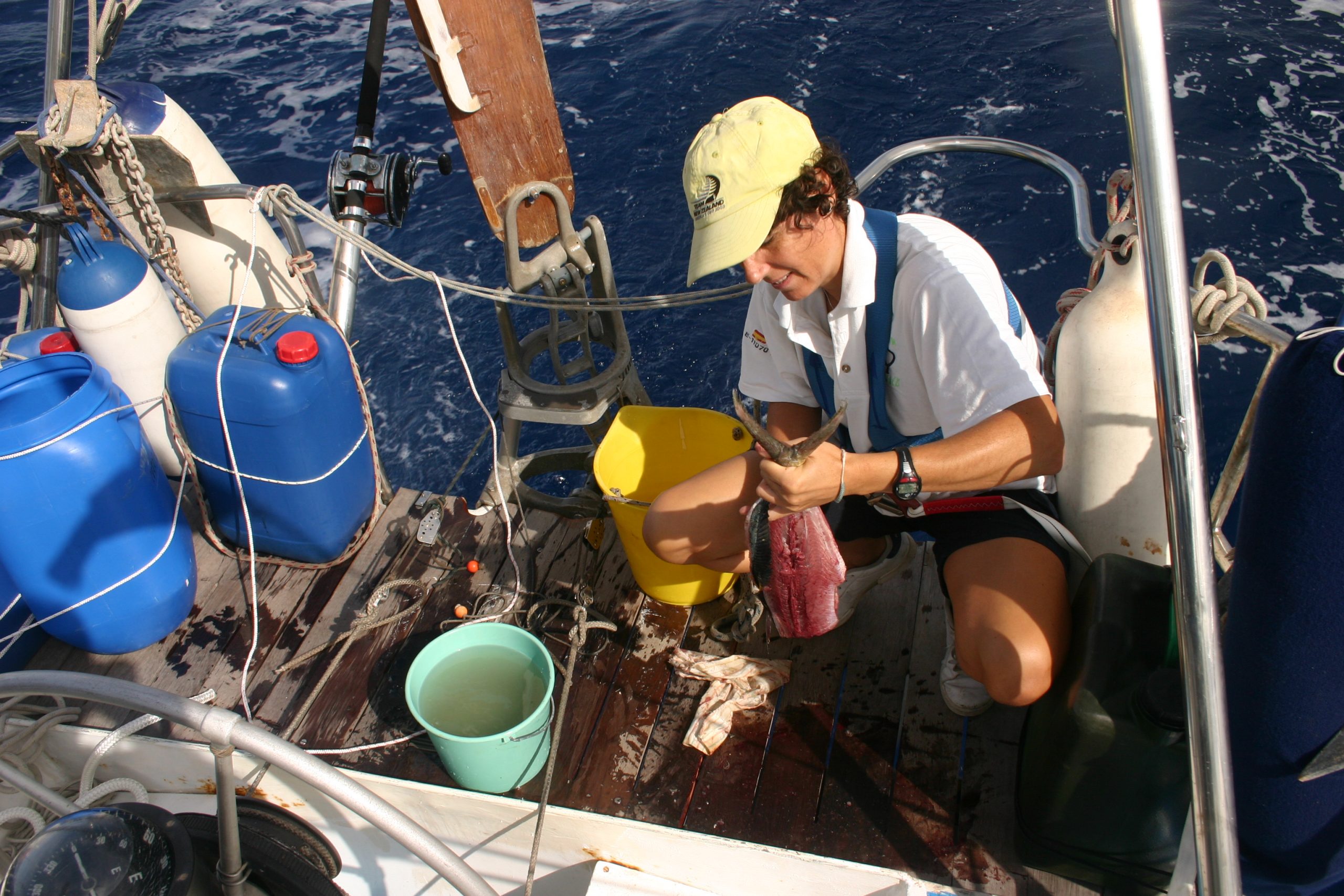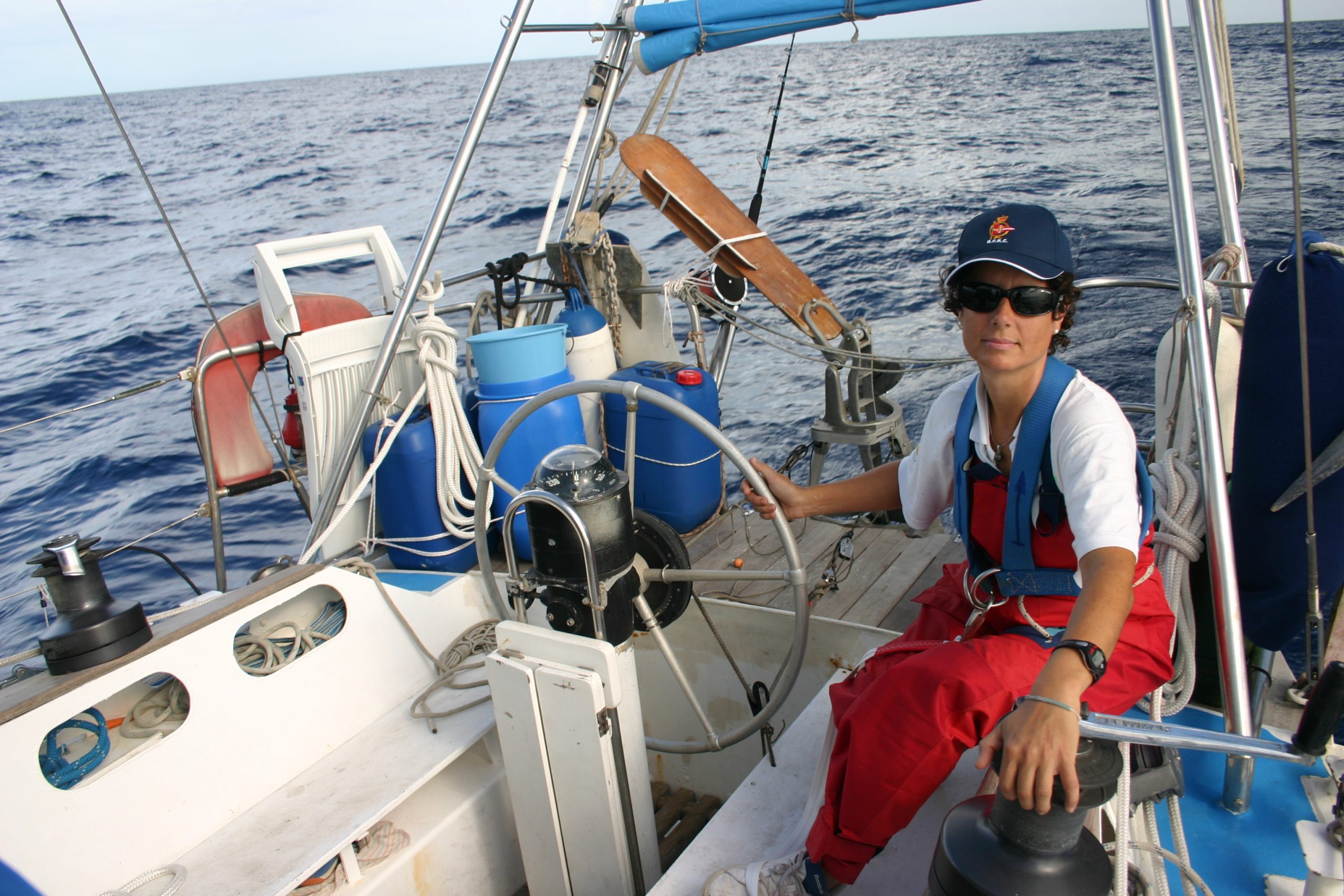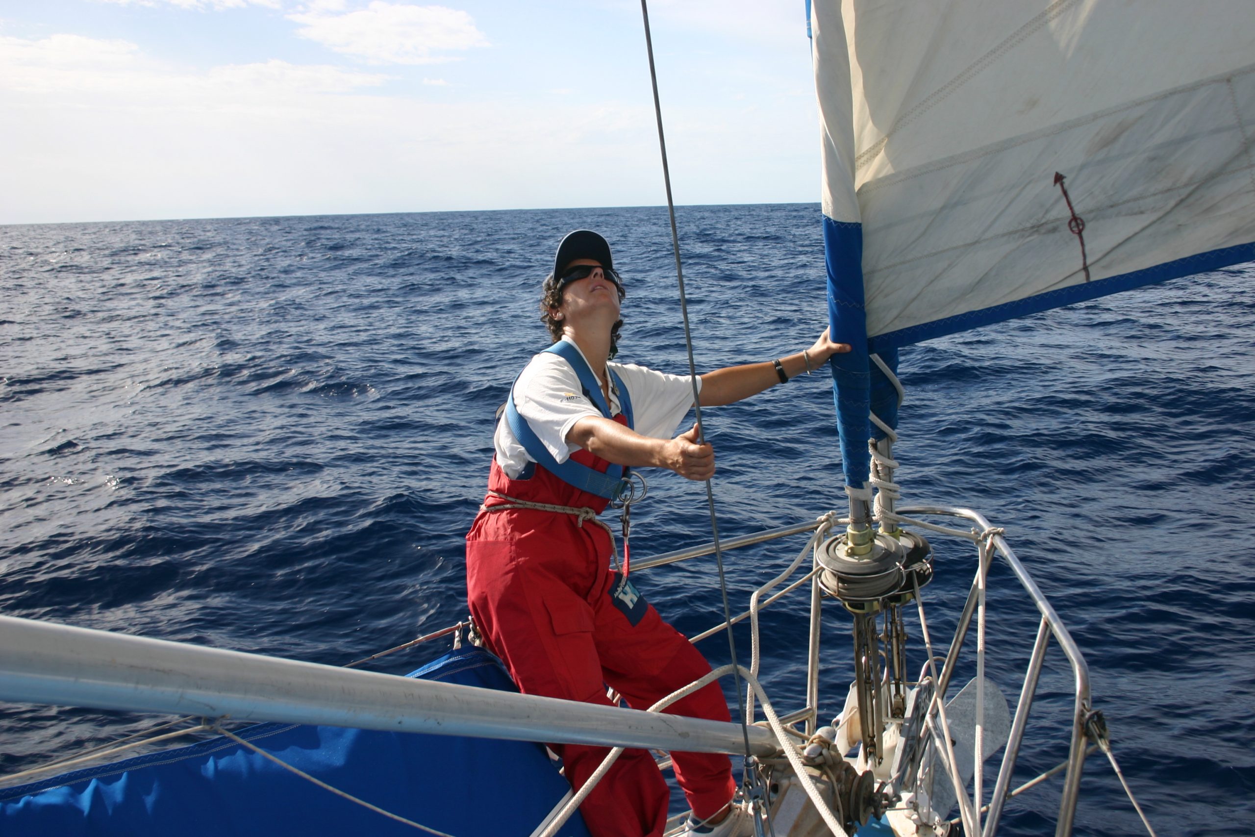 Me despierto con un balanceo inusual y un ruido fuerte. Llueve a cántaros y son las 06:00 GMT. Me calzo y me pongo el arnés de seguridad y enrollo los génovas hasta dejarlos bien pequeños. Estoy calada hasta los huesos.
