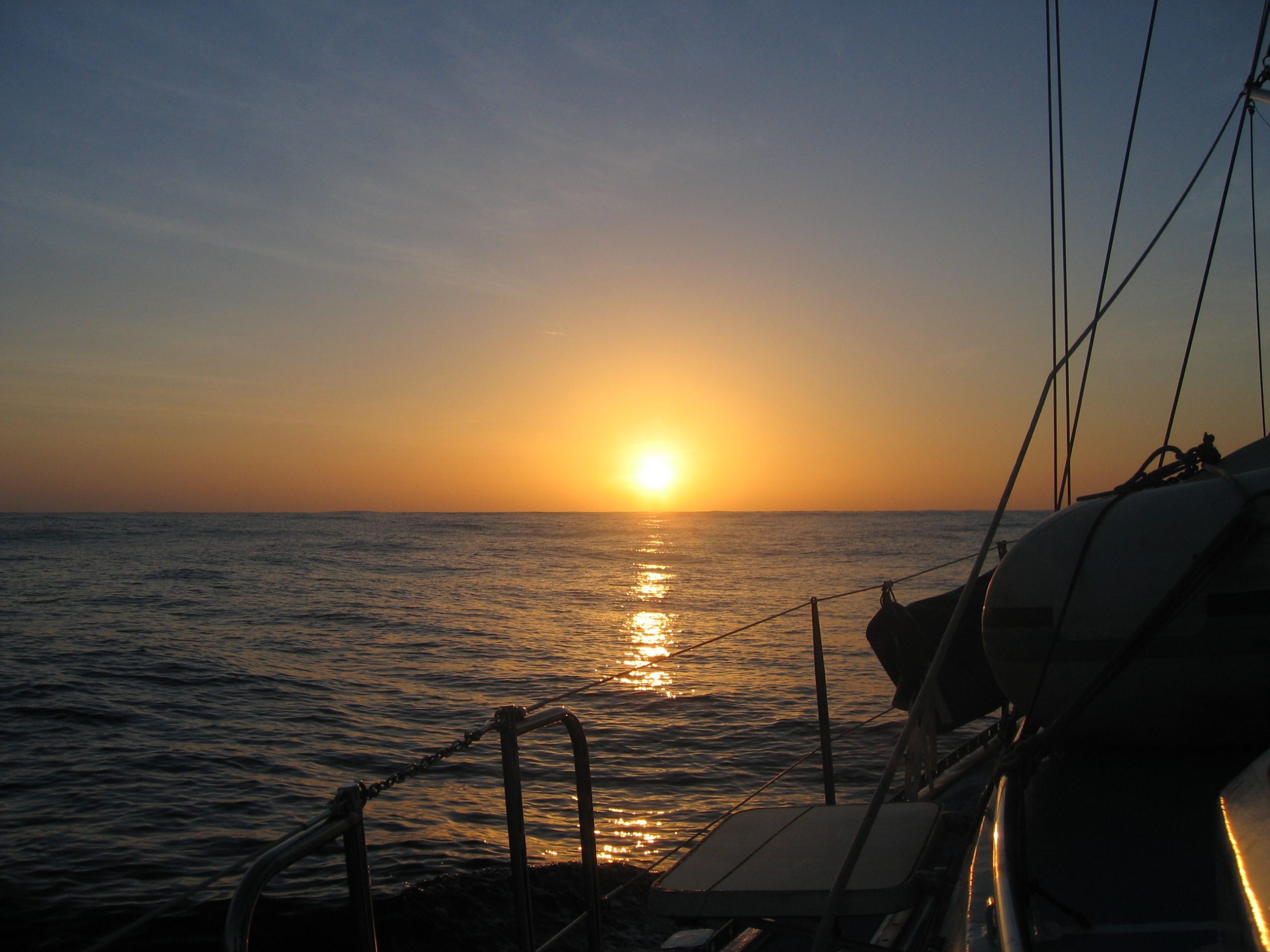 El día transcurre tranquilo, hace una media de 10 - 12 nudos y una velocidad entre 5 y 6 nudos con vientos del ENE y poca ola aunque algo nublado. La puesta de sol es imponente y el cielo entero se